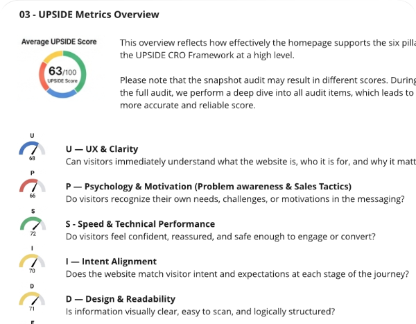 We analyseren je pagina en beoordelen highlevel conversiesignalen volgens het UPSIDE CRO-framework.